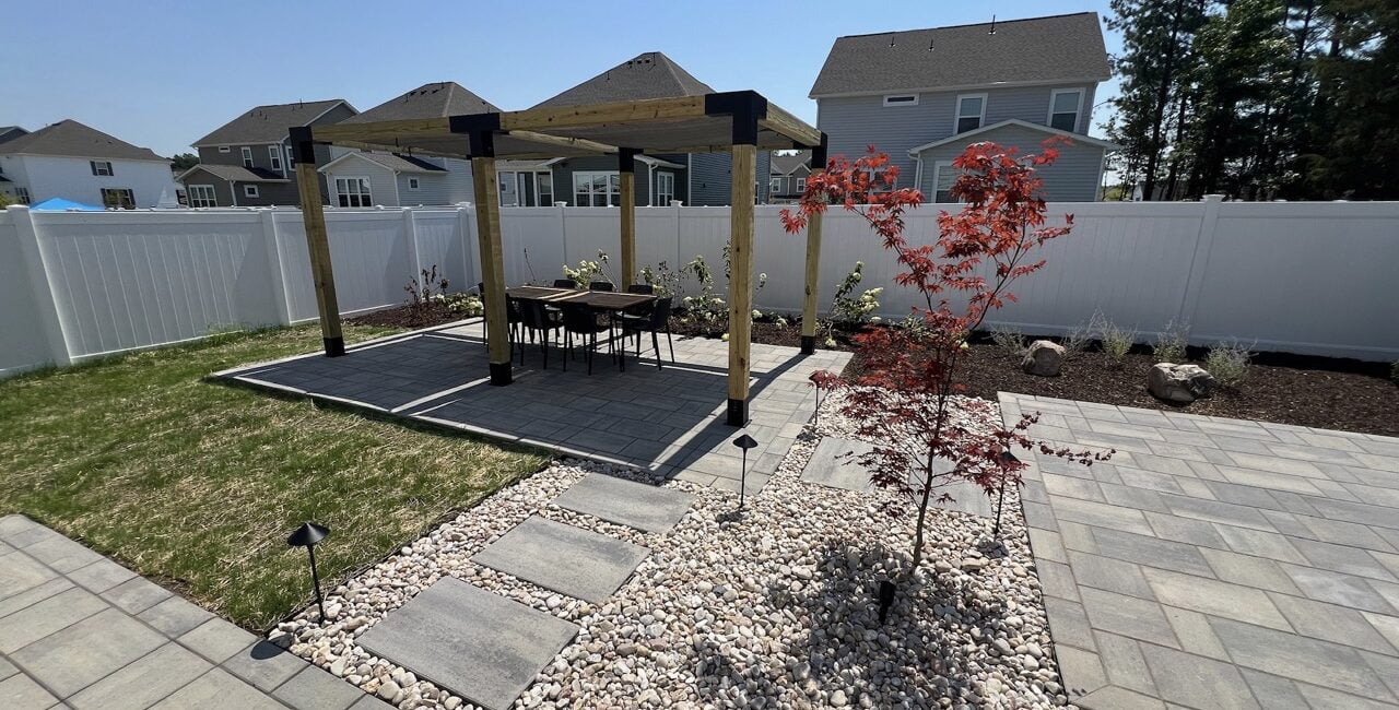 Instead, we focused on balance. The portable fire pit gives them flexibility. The pergola delivers shade without overwhelming the yard. The modern paver layout creates structure while still feeling relaxed. Landscaping softens the edges and integrates the build into the surrounding property. Integrated lighting ensures the space remains usable even after the sun goes down.