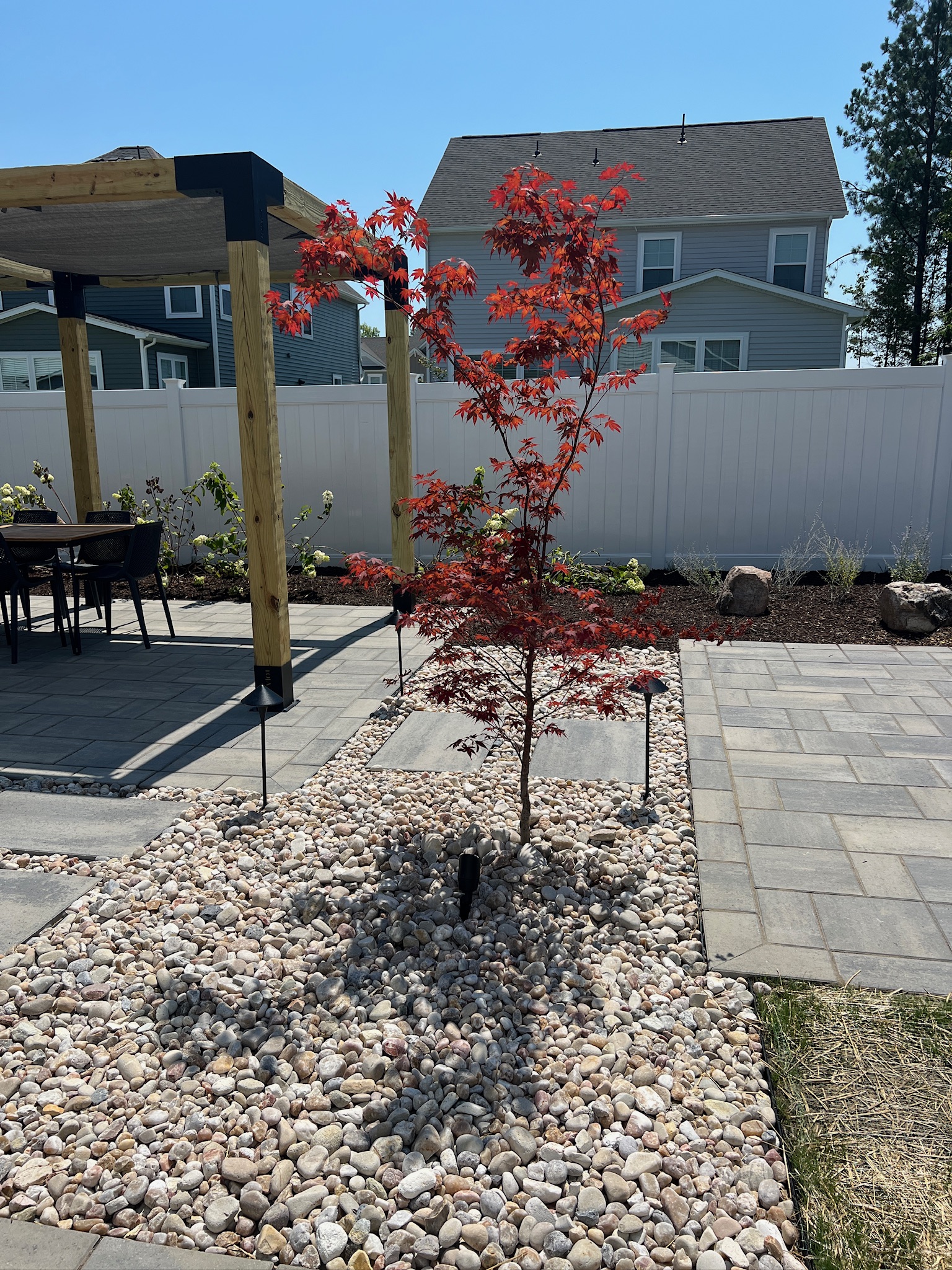 We also suggested planting a maple tree near the center of the space. While it may seem like a small addition today, that tree will eventually provide natural shade and soften the hardscape, adding both visual interest and long-term comfort.