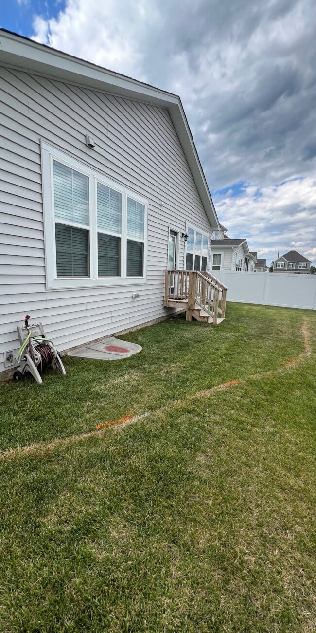 One of the most impactful upgrades came near the house. Kim and Matt originally had basic wooden steps leading into the yard. We encouraged them to consider a paver landing instead — something wider, more functional, and visually connected to the rest of the patio.