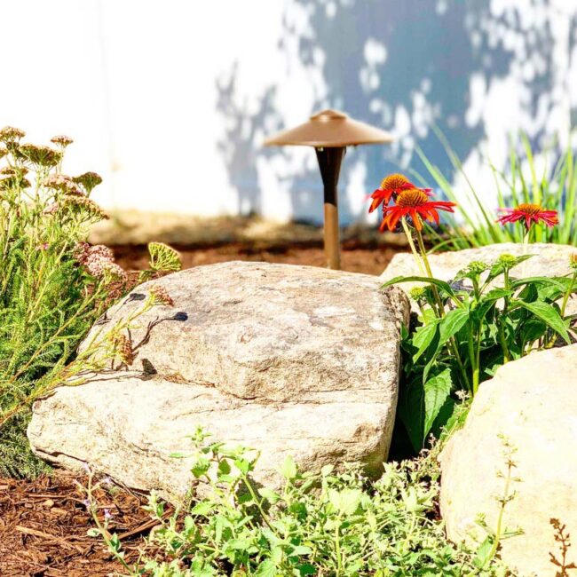 ​​With our landscape almost complete and our waterfall done, we then moved onto the final goal: low-voltage LED lighting. It wouldn’t be complete without it! For the final touch, we backlit the waterfall to cast rippling shadows against the trees and back of the house. We also incorporated three boulder displays into the space, each with their own landscape lighting.
