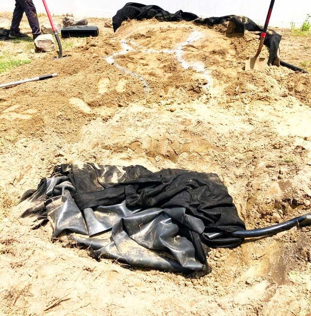 We then moved to excavating a basin for our pond’s reservoir. We used the soil to backfill against our boulder wall. Thankfully, we had enough soil from our basin and did not need to bring in any additional soil.