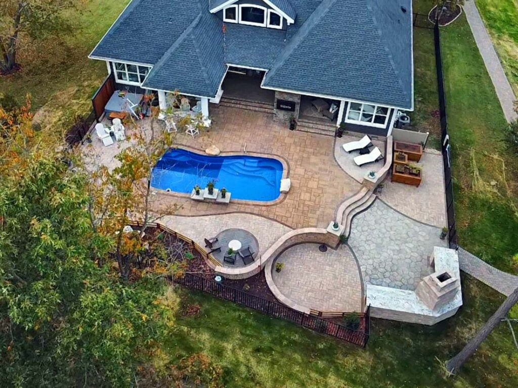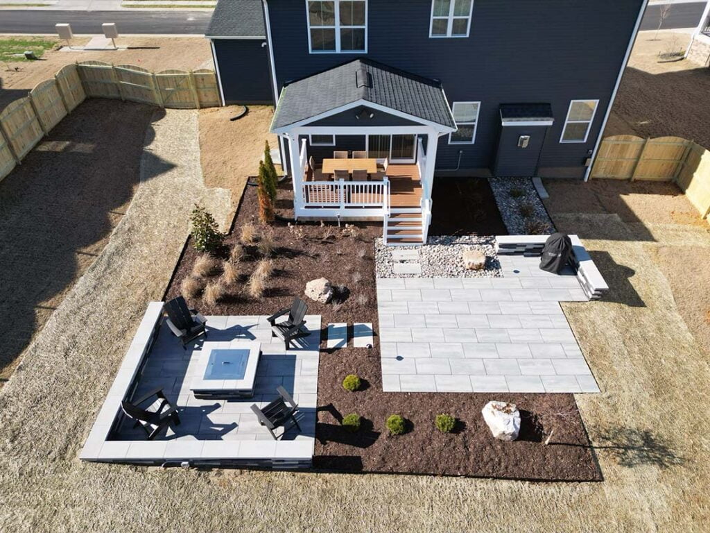With this option, you are no longer looking for a simple patio. You’re excited about having a patio and space with a few upgrades. Typically with the Premium Patio package we frame the space with a contrasting paver border. We also frequently have to run drainage through the patio or grade changes. For our Premium Patios we like to explore other pavers in the Techo Bloc and Belgard catalog like Blu60, Villagio, or Dimensions. These alternate pavers really start to develop the patio into a statement piece rather than a hard surface to setup furniture.