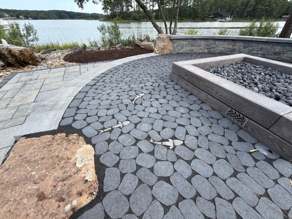At the heart of the design is a circular inlay using Techo Bloc Antika pavers, softened with custom fish-shaped paver details that quietly nod to the waterfront setting.
