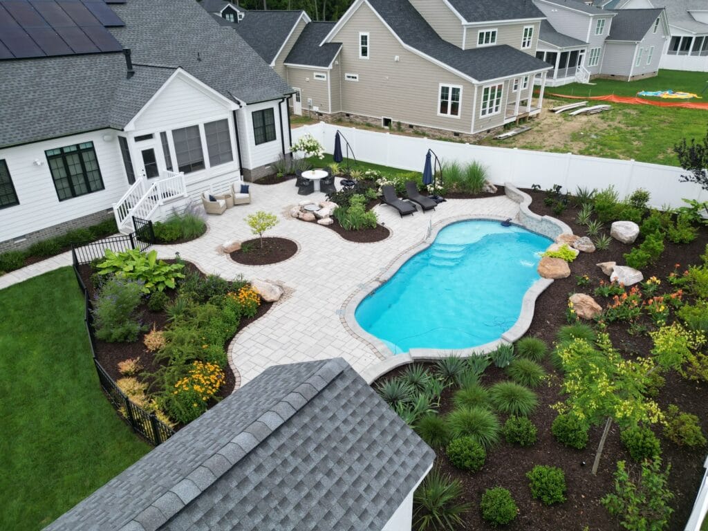 The goal was to turn a builder-grade yard into a space with depth and personality. Working alongside River Pools, we focused on designing a landscape that felt established, something that looked like it had always belonged to the home, not something added as an afterthought.