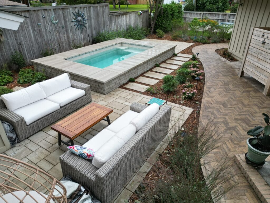 At the center sits a 7’ x 13’ plunge pool from Soake Pools, complete with wall and coping that blend seamlessly into the hardscape.