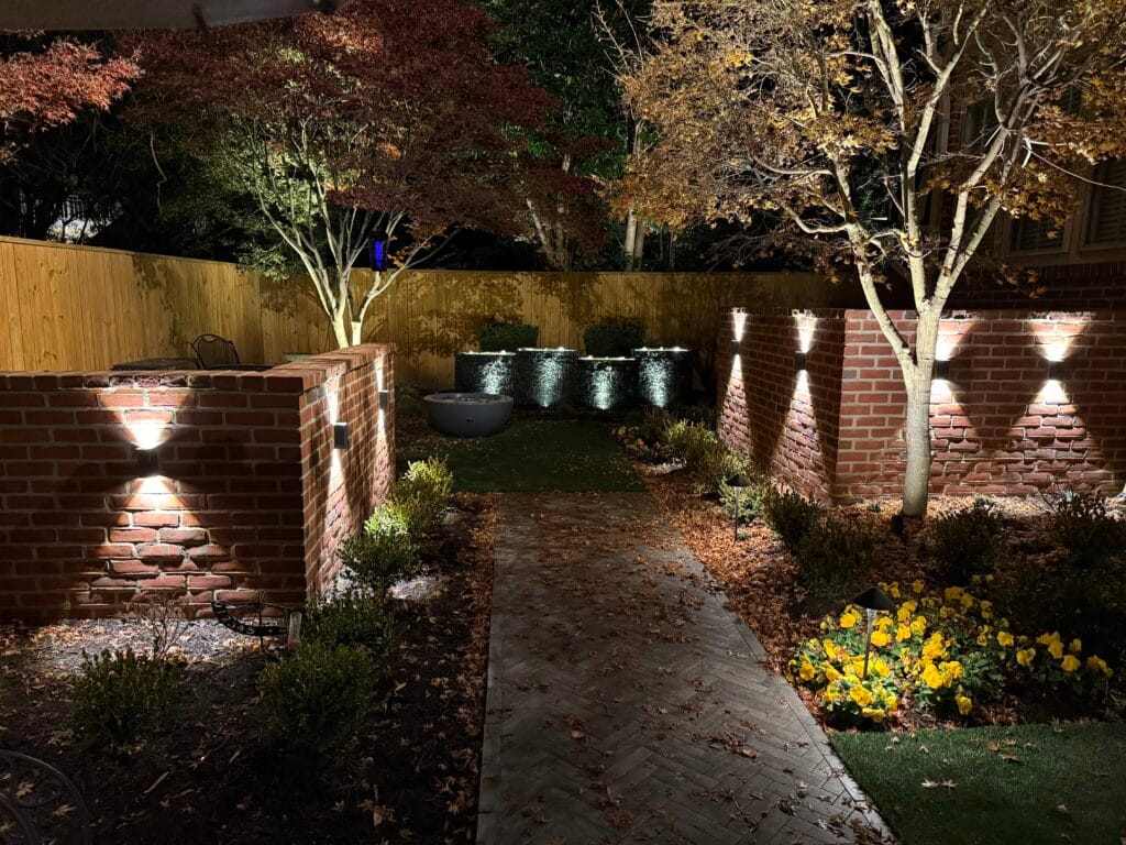 A water wall feature adds sound and movement, while a fire bowl creates a warm focal point. Landscaping and lighting were layered throughout to soften edges, add depth, and make the space just as enjoyable after dark.