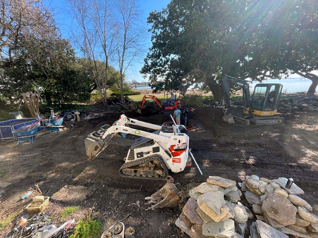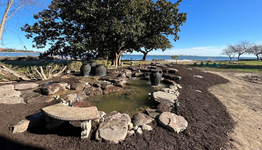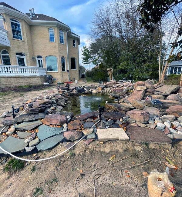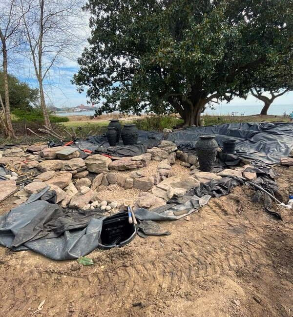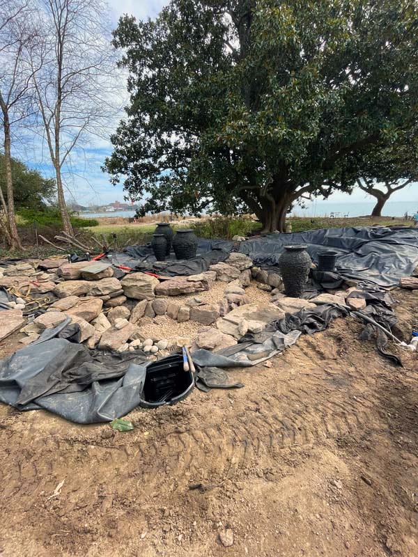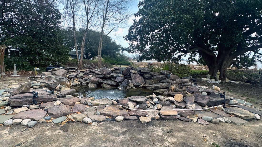 The job of the skimmer is to grab and remove debris from the pond before it sinks to the bottom. Large debris is captured in the skimmer basket, and any smaller pieces will get caught as the water passes through the horizontal mat. This pond sits right beneath a very large, very beautiful Magnolia tree, so there is a decent amount of debris that’s going to fall! These skimmers are going to make keeping the pond clean so much easier. They even have a natural-looking faux rock lid which helps to protect the pump and internal components without sacrificing the natural beauty of the pond!