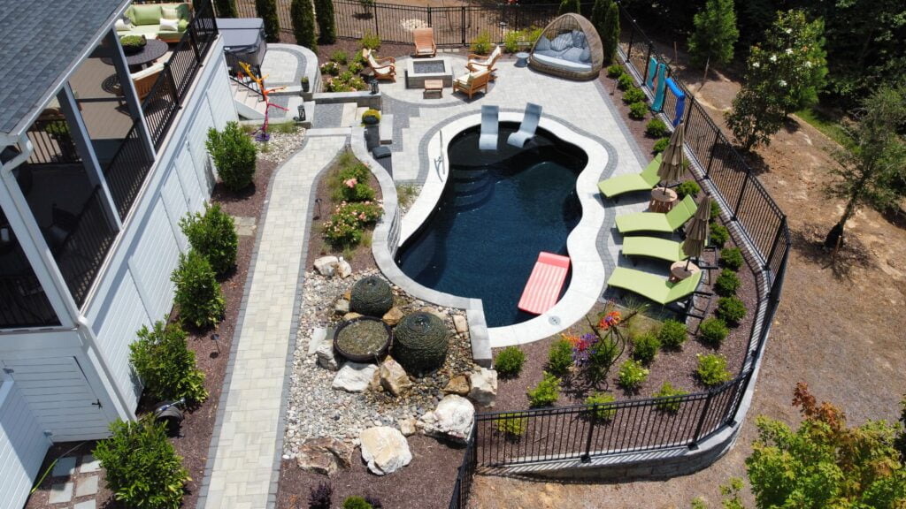 Many times our clients opt for a fiberglass pool over concrete because of speed and price. Concrete pools don’t come for less than $100,000. They also tend to take months to construct because of the steps involved. Large, irregular shaped pools look amazing in concrete with a finish that isn’t available in any other style.