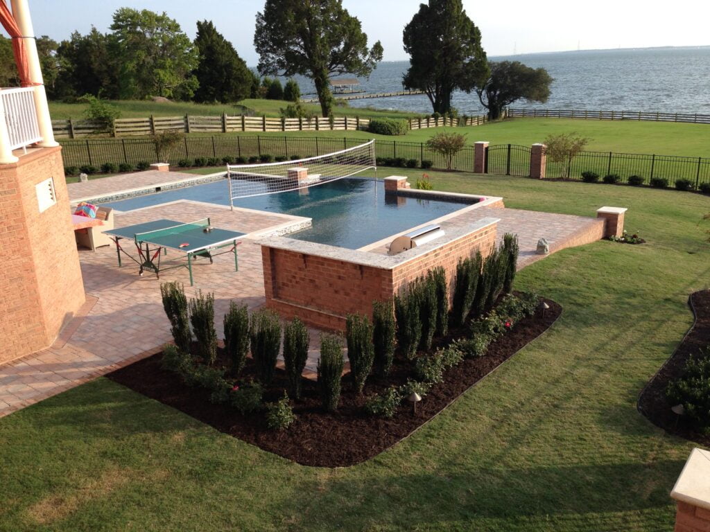 These are the cheapest option available and possibly the most popular in Coastal Virginia. I see vinyl liner pools everywhere. They frequently have a metal or plastic coping and can be built in many different sizes. Unlike fiberglass, they don’t have restriction on size.