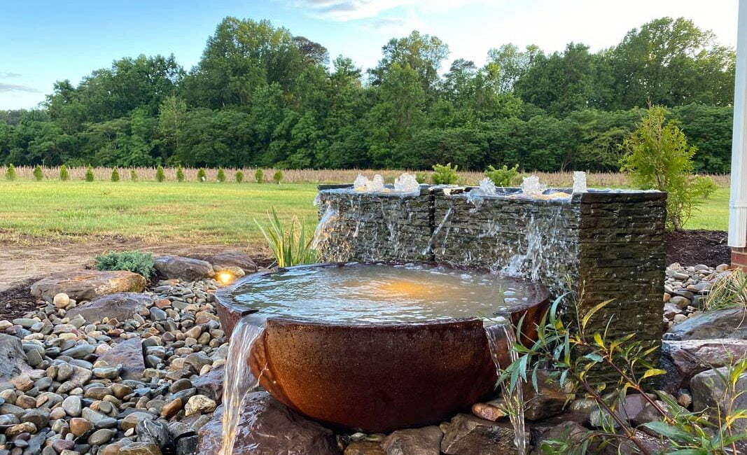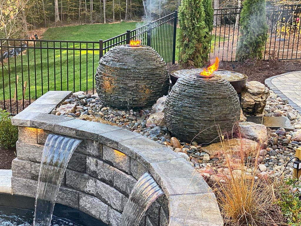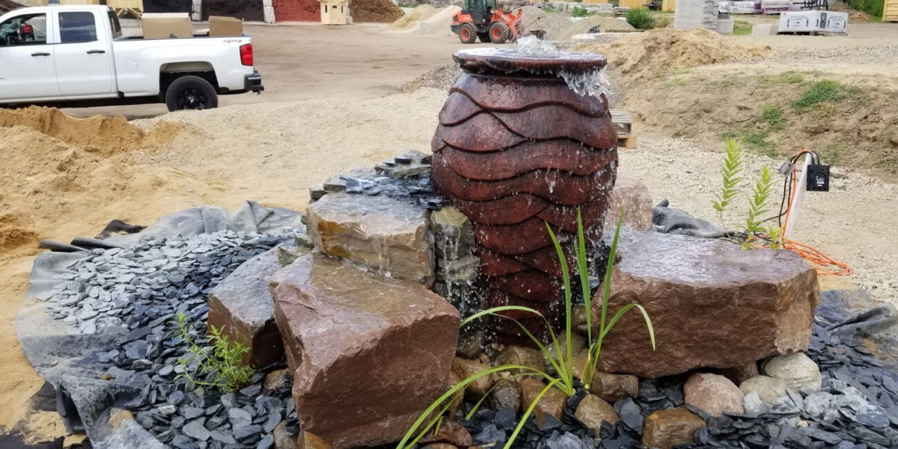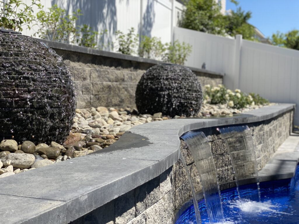 Incorporating a fountain is an easy way to add height to a feature with out creating a “volcano.” Urns, spheres, and bowls can add 15-50″ of height. We especially like to use these fountain components when there are multiple vantage points. A fountain can easily allow the water feature to be seen from the side or back, allowing the sound and visual interest to fill the space better.