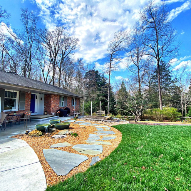 Using a fountain by the front step or gate will create a warm, welcoming statement. A front fountain could be a simple bowl set or stacked slate sphere. We could also build a bridge across a stream or pond to make a bold entrance to the home.