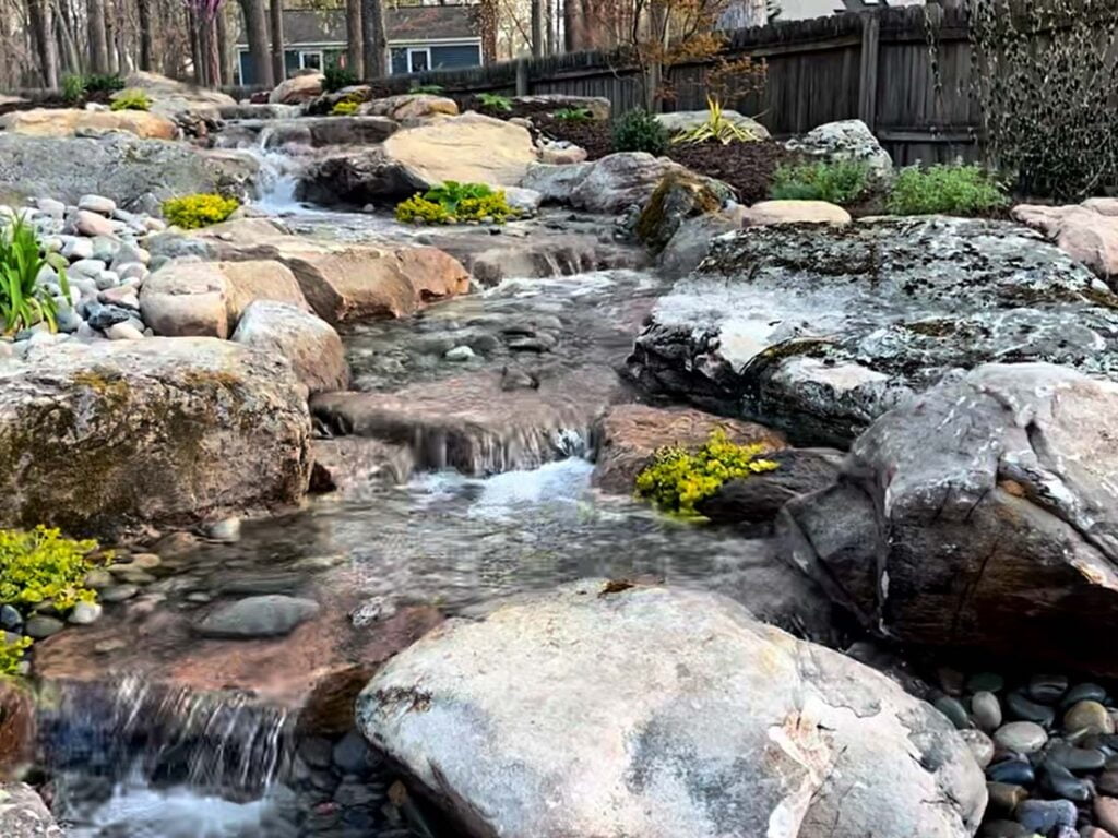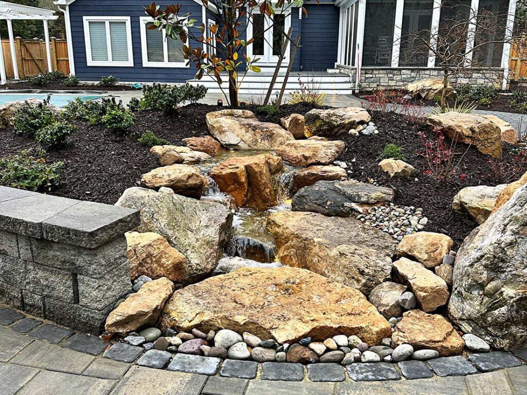 Creating an access point for dogs or kids is fairly simple. Larger boulders and other components would be used to make sure it can withstand the traffic. Extra care goes into stabilizing the fountains by filling them with stone so they cannot be moved. We will also take the time to add additional protective underlayment for the liner to avoid punctures from puppy paws and traffic.