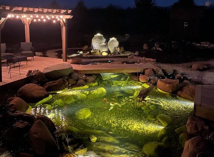 One pond or two ponds? Lighting in and around the pond can create a totally new pond at night, setting off the whole yard.